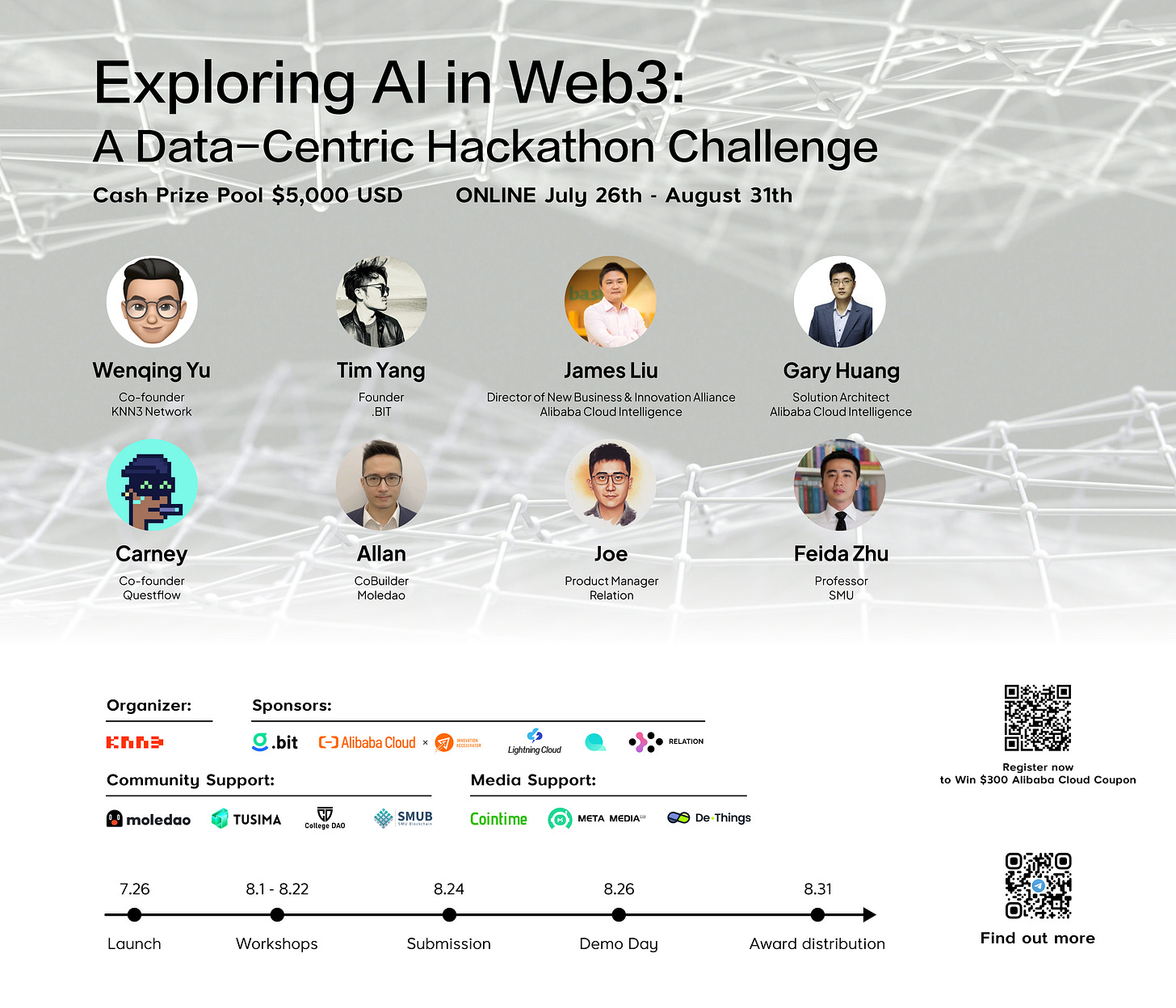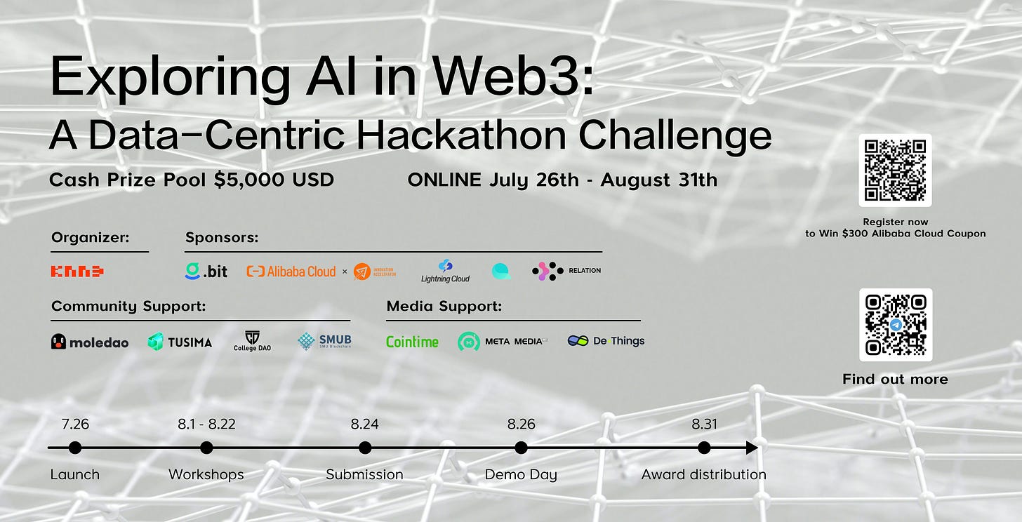 As a one-stop Web3 User-centric DataFi solution committed to promoting the fusion of AI and Web3, KNN3 Network is hosting an event “Exploring AI in Web3: A Data-Centric Hackathon Challenge” from July 26th to August 31st, generously sponsored by .bit, Questflow, Relation, AlibabaCloud, Lightning Cloud. A special thanks to our community & media partners: Moledao, TusimaDAO College DAO, SMUB, Cointime, Meta Media and De Things.