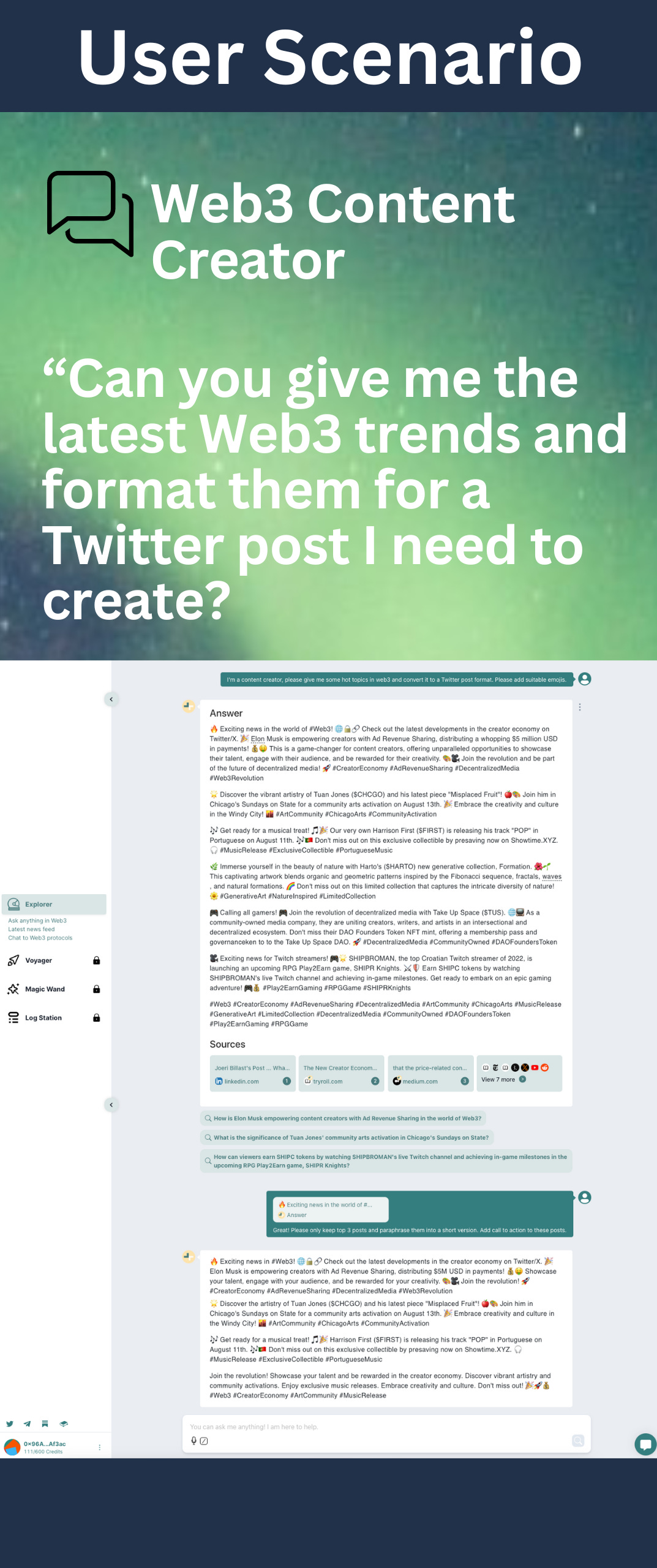 Emily, a media professional focusing on Web3 content creation, turns to TypoX AI for the latest updates. Seeking to amplify her social media presence, she requests assistance in generating Twitter-ready content.