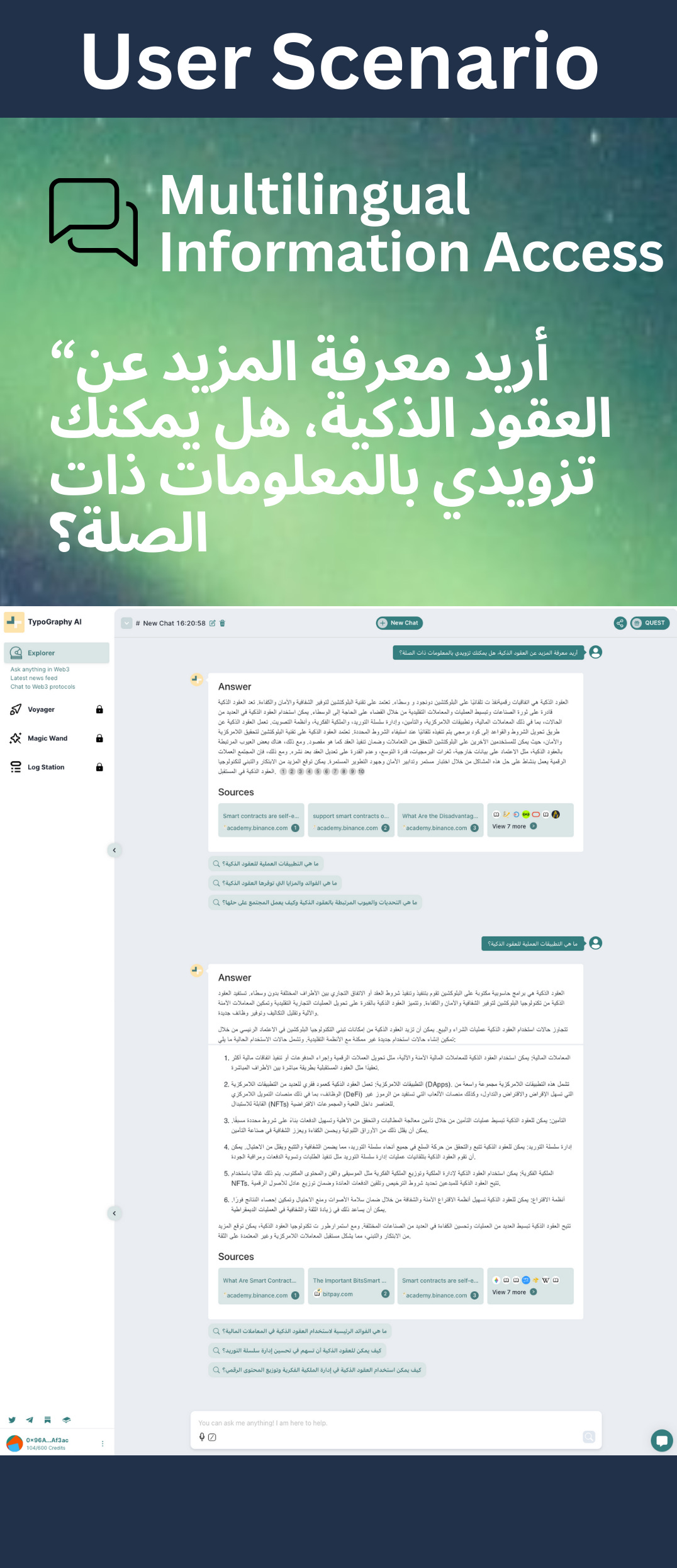 TypoX AI seamlessly recognizes Zoe's language preference, delivering search results in Arabic and responding in her mother tongue. This functionality showcases TypoX AI's prowess in providing a cross-language global search, breaking down language barriers and making Web3 accessible to users in various languages.